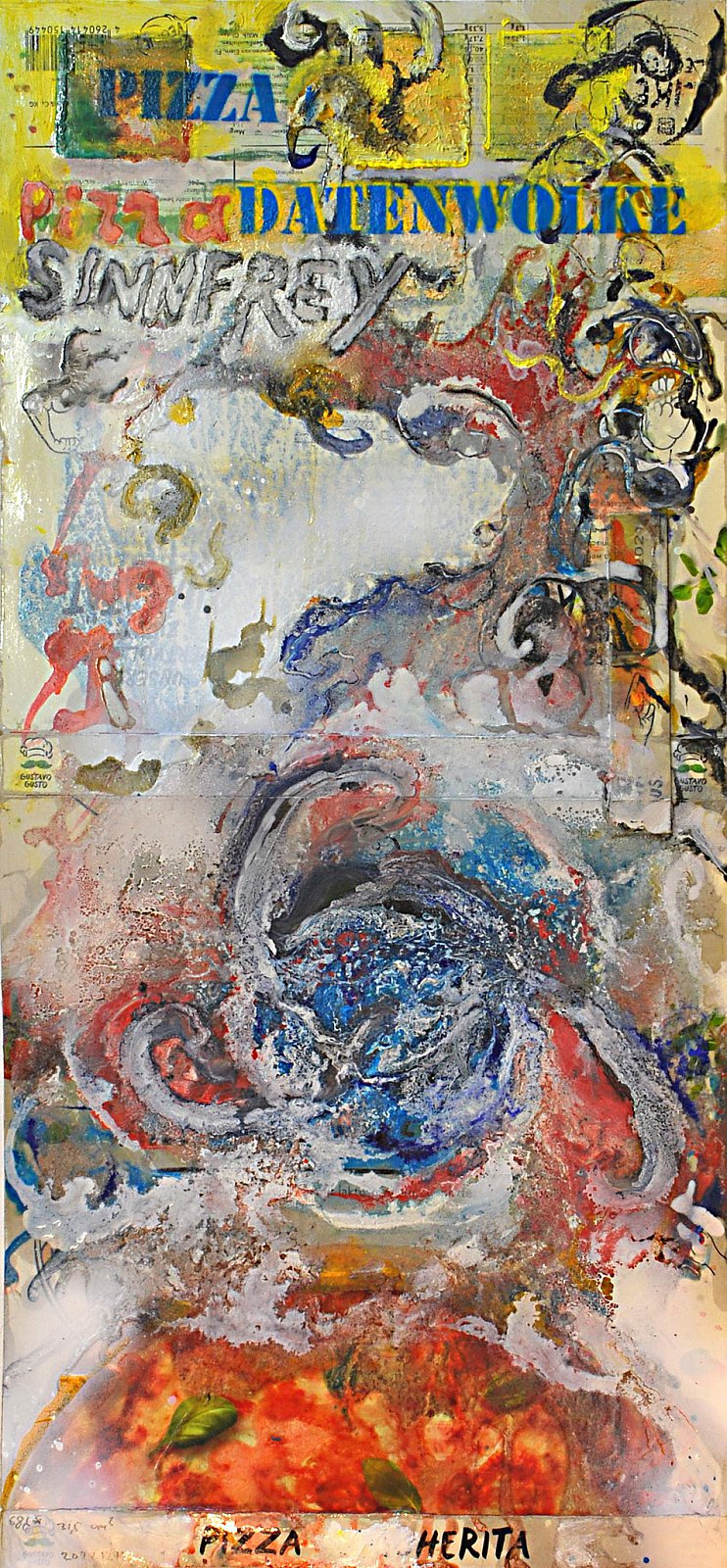 Pizzabilder sind eine malerische Bearbeitung von Konsumpapieren, z.B. Pizzaumverpackungen oder Supermarktprospekten. Pizzabilder haben sich im Umfeld von Plotterland seit 1995 entwickelt und stellen eine zeitgemäße und auch zeitgebundene malerische Auseinandersetzung mit unserer Konsumwelt dar. Der Konsument ist ja ein Reisender im Weltall der Warenvielfalt, sozusagen ein Konsumnaut.