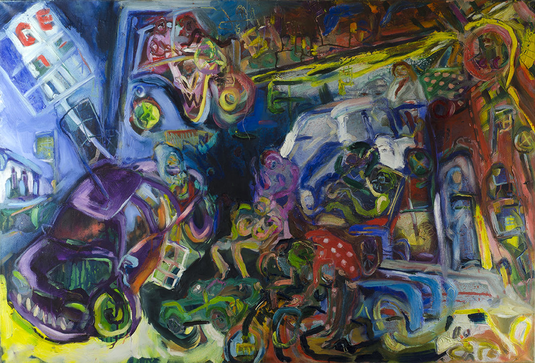 Im Schutzraum des Atelier ist diese Malweise verändert, und die Bilder entstehen durch einen mehr oder minder langwierigen Prozess des Über-und Ummalens.